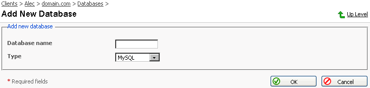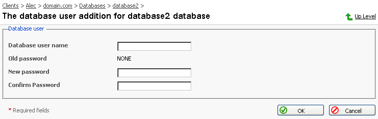 ユーザ名を指定して、新しいパスワードテキストボックスおよび確認パスワードテキストボックスにパスワードを入力します。[OK]をクリックすると、新しいユーザの作成が完了します。[上へ]をクリックすると、すべての入力が無視され、変更なしにデータベース編集ページに戻ります。