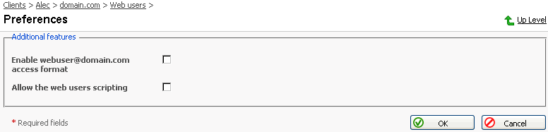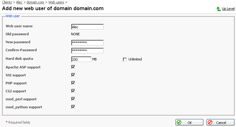 新しいWebユーザの名前、パスワードを入力して、ドメインのハードディスククォータおよび利用可能なスクリプトオプションの設定を行います(選択設定で許可されている場合)。